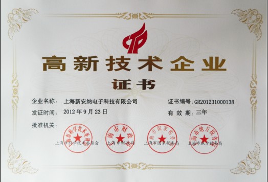 2012/09/23新安納榮獲上海市高新技術企業(yè)