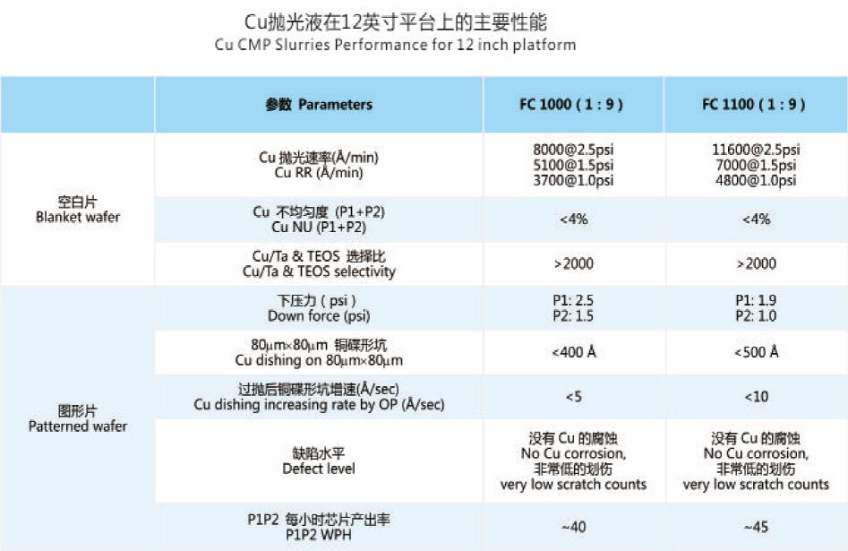 FC-1000系列銅拋光液主要用于集成電路芯片中銅互連CMP工藝。